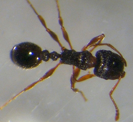 Description: 1/16 to 1/8 inches dark body and lighter legs. Nest outside under flat stones, sidewalks along curbing, ect. invade structures in search of food particular problem with slab construction. Inside they nest in walls, insulation, floors. Will feed insects, meats, seeds, sweets and grease